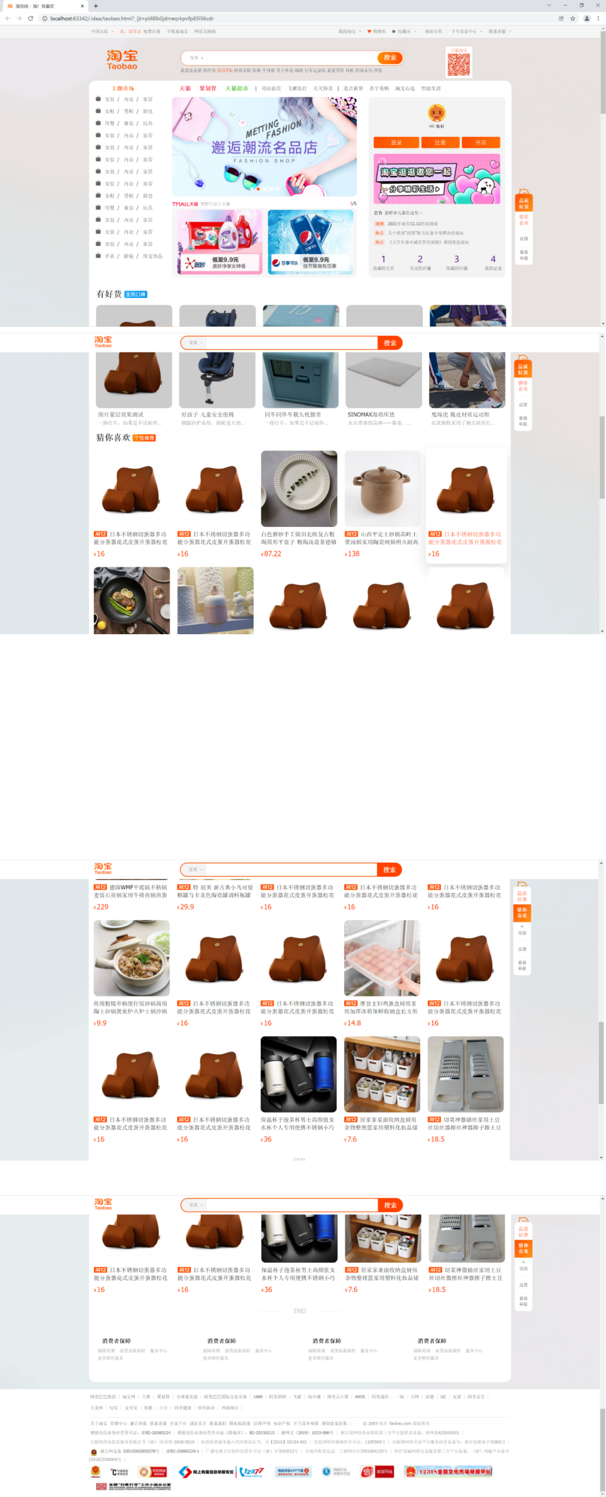 (3)js:对页面内切换效果使用jquary进行实现,如顶部搜索栏宝贝中“天猫和店铺的切换”;滚动条监听,实现右侧悬浮导航跳转、回到顶部功能;轮播图状态切换,是采用增删class来实现的,所以没有动效…